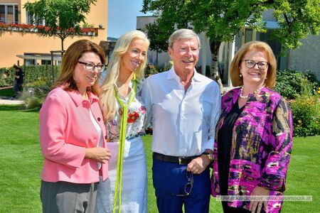 Bild 4: 2005–2025: 20 Jahre Hotel Schloss Mönchstein und Dr Hans-Peter Wild. Ein Rückblick., von links: Samantha Teufel, Direktorin, Christine E. Drage, Lebensgefährtin von Dr. Wild, Dr. Hans-Peter Wild und Helga Halbedl, kaufmännische Direktorin.