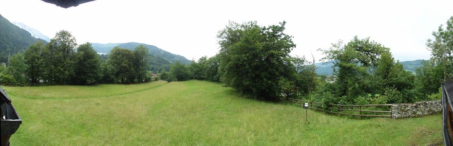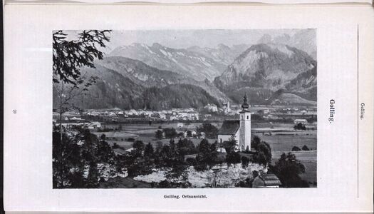 Bild 1: Blick über die Gemeinde Torren mit der Wallfahrtskirche St. Nikolaus zur Marktgemeinde Golling, Aufnahme 1914.