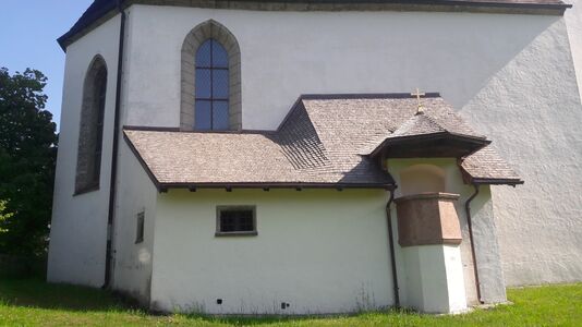 Auffallend ist die Außenkanzel (wie sie beispielsweise auch noch, wohl in anderer Form, an der Wallfahrtskirche zur Hl. Margaretha in Bad Vigaun erhalten ist). Alois Hettegger, Obmann des örtlichen Pfarrkirchenrats (2010), vermutet, dass früher auf der Wiese für eine größere Zahl von Wallfahrern die Messe gelesen wurde.