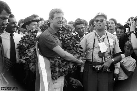 Der damalige Pressechef von Porsche Österreich Helmut Krackowizer gratuliert dem Sieger der Rennwagenklasse beim Internationalen Auto- und Motorradrennen Flugplatz Zeltweg 1958 Wolfgang Graf Berghe von Trips, der einen Porsche RSK 1600 fuhr.