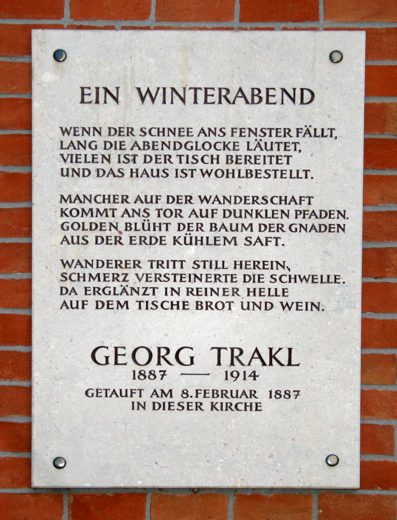 | 09:13, 2. Mai 2008 | Christuskirche tafel trakl.jpg (Datei) | 226 KB | Arne | {{Bildbeschreibung|Gedenktafel an der Christuskirche in Salzburg. |eigene Arbeit |Arne Müseler |27.4.2008 |- |© [http://arne-mueseler.eu/ Arne Müseler], vor einer Weiterverwendung bitte unter arne.mueseler@gmail.com melden. }} | 1 | |