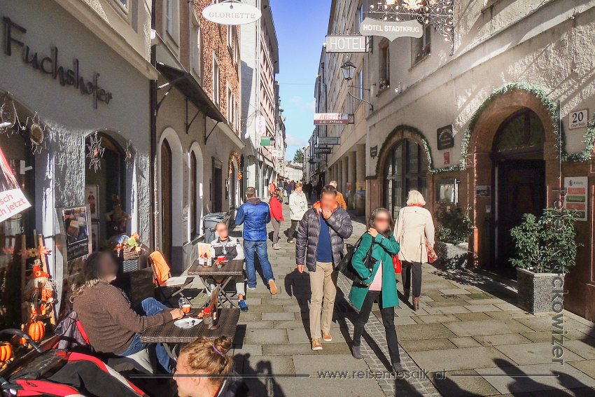 - Blick in die Linzer Gasse stadtauswärts beim Hotel Stadtkrug Salzburg (rechts) in der rechtsufrigen Altstadt der Stadt Salzburg.