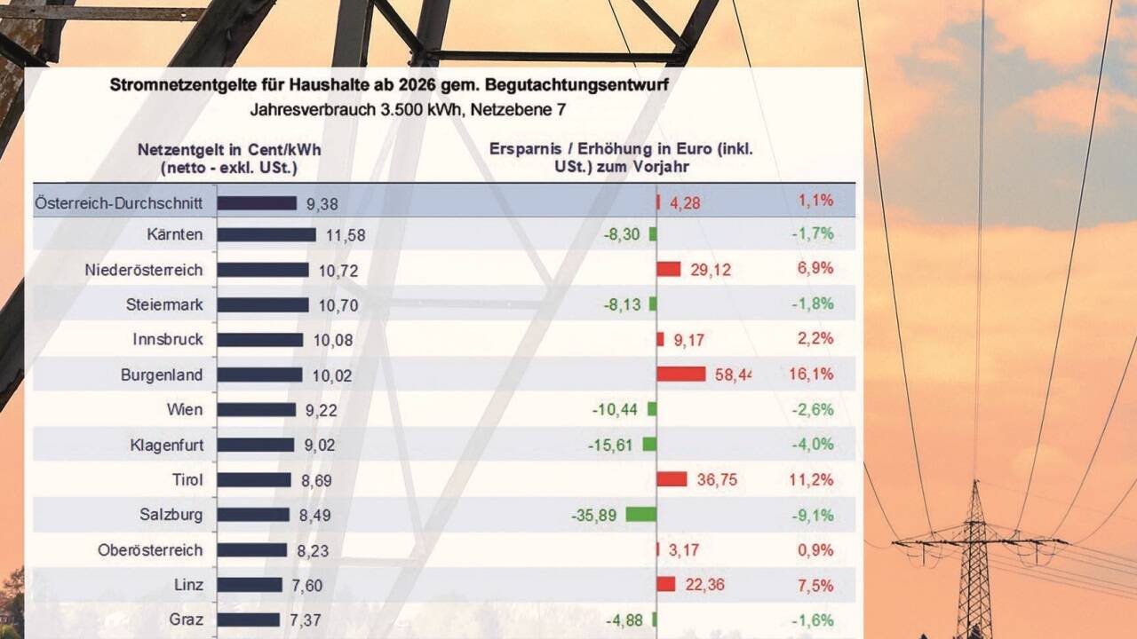 Nach dem drastischen Anstieg der Netzkosten 2025 wird es im kommenden Jahr für einen guten Teil der Haushalte wieder besser. Am Montag hat die Energieregulierungsbehörde E-Control die Vorlage für die Netzentgelte 2026 in Begutachtung geschickt.